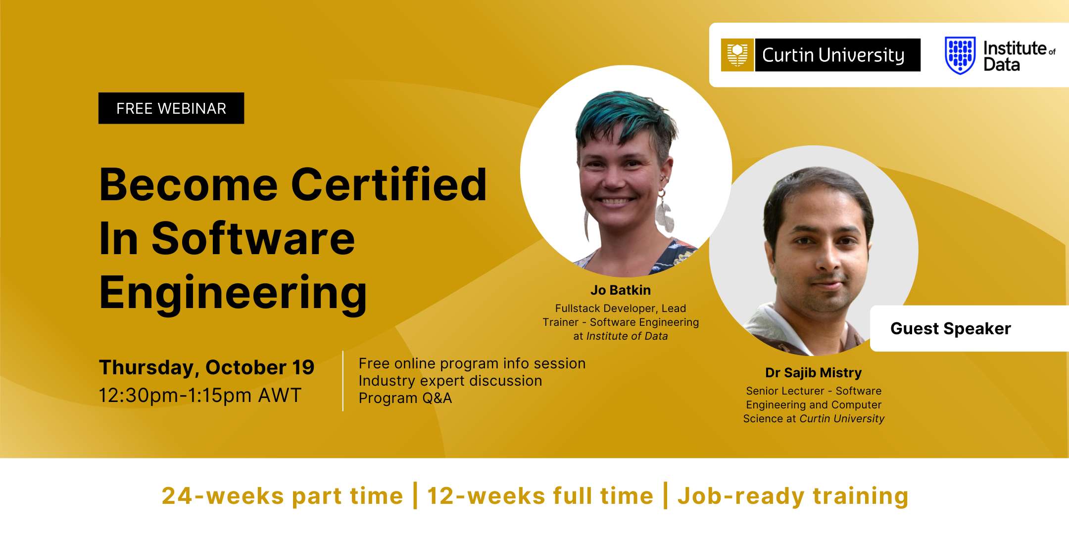 Join the online info session to learn more about the Institute of Data’s Software Engineering part time and full time training programs and have your career questions answered by industry experts and course trainers.
