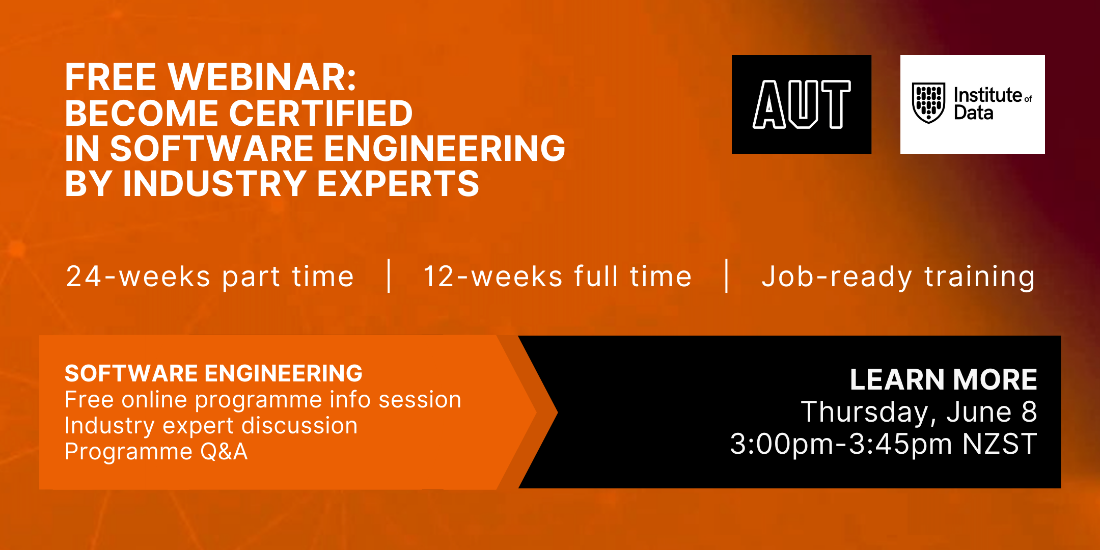 Join the online info session to learn more about the Institute of Data and Auckland University of Technology’s upcoming Software Engineering Part Time and Full Time training programs in New Zealand!
